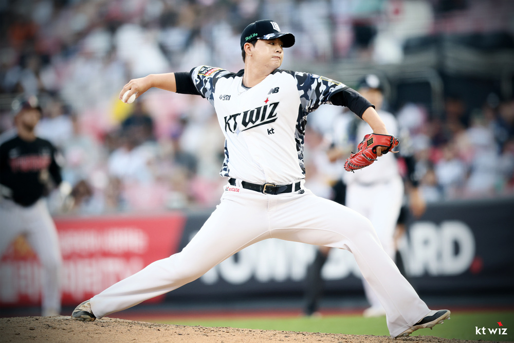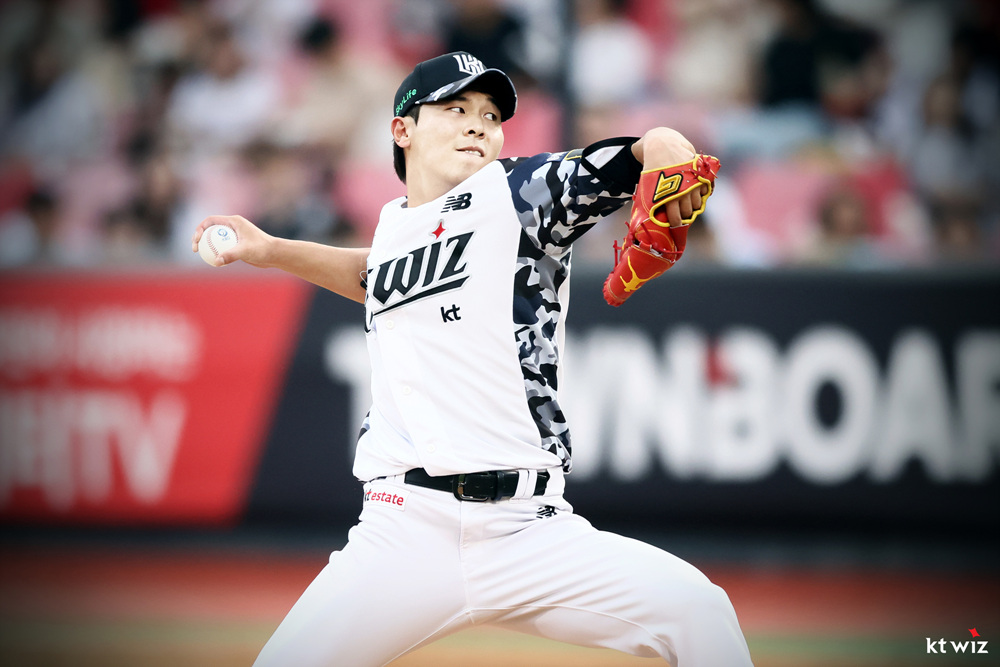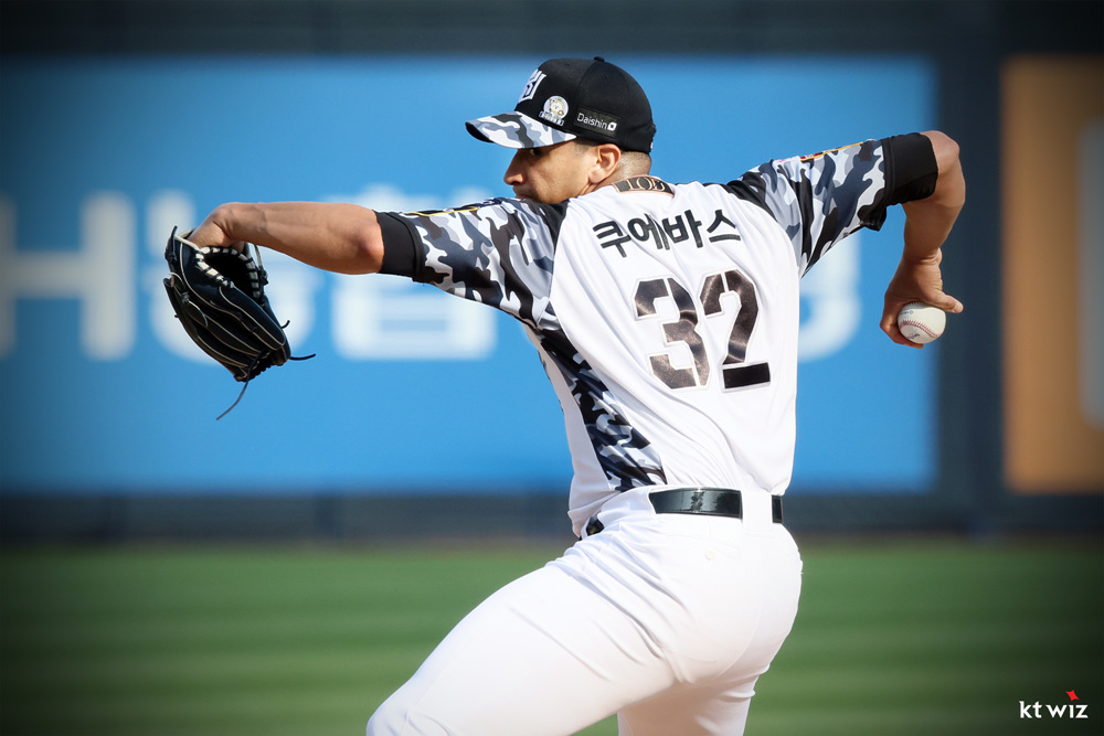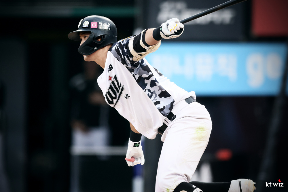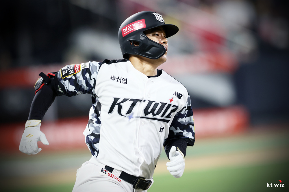 2024년 6월 11일2024년 9월 5일 KT WIZ 2024 Military Jersey KT 위즈 2024 밀리터리 유니폼 KBO League 2019년의 KT위즈 밀리터리 유니폼의 heritage를 계승하여 현대적인 해석을 통해 새롭게 탄생한 2024년 KT위즈의 공식 밀리터리 유니폼이다. 블루톤의 카모플라쥬를 적용하여 국군의 숭고한 희생을 기리고 선수들의 수원을 대표하는 사명감을 상징하는 어깨 견장을 상징하는 블랙 컬러가 디자인 포인트이다. 관련